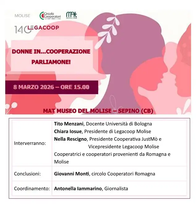 Domani, 8 marzo 2026, alle ore 15.00, la splendida cornice del MAT - Museo del Matese a Sepino ospiterà l’incontro "Donne in... Cooperazione. Parliamone!". L'evento, organizzato dal Circolo Cooperatori dell’Emilia Romagna in collaborazione con Legacoop Molise e il MAT, si pone l'obiettivo di mettere al centro del dibattito il ruolo femminile e le sfide del mondo cooperativo contemporaneo.